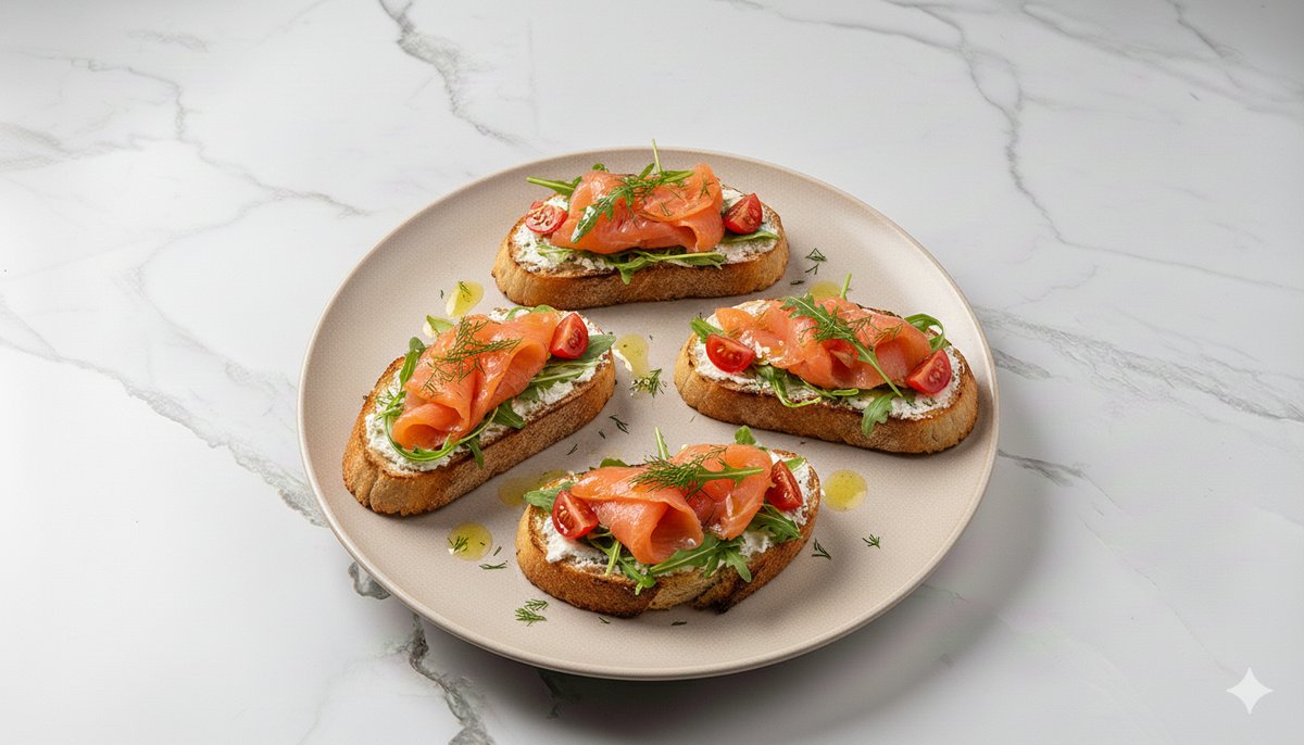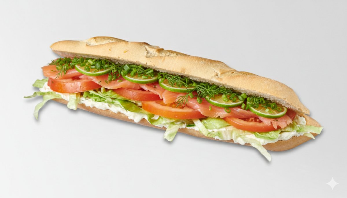 With salmon, cream cheese, lime, lettuce, tomato, fresh onion and herbs