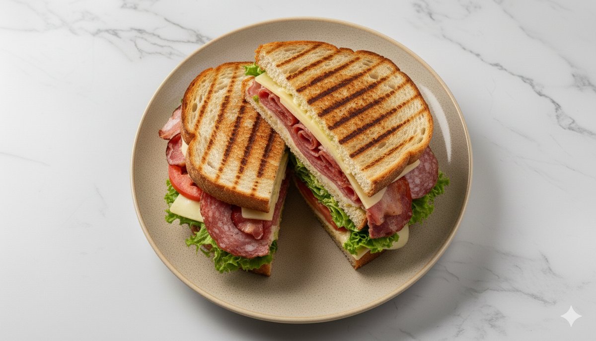 With gouda, ham, bacon, tomato, lettuce and mayonnaise