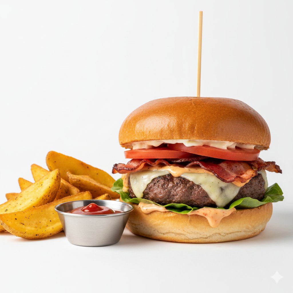 With 200g beef burger, cheddar, bacon, tomato, lettuce, mayonnaise and cocktail sauce. Served with potato wedges