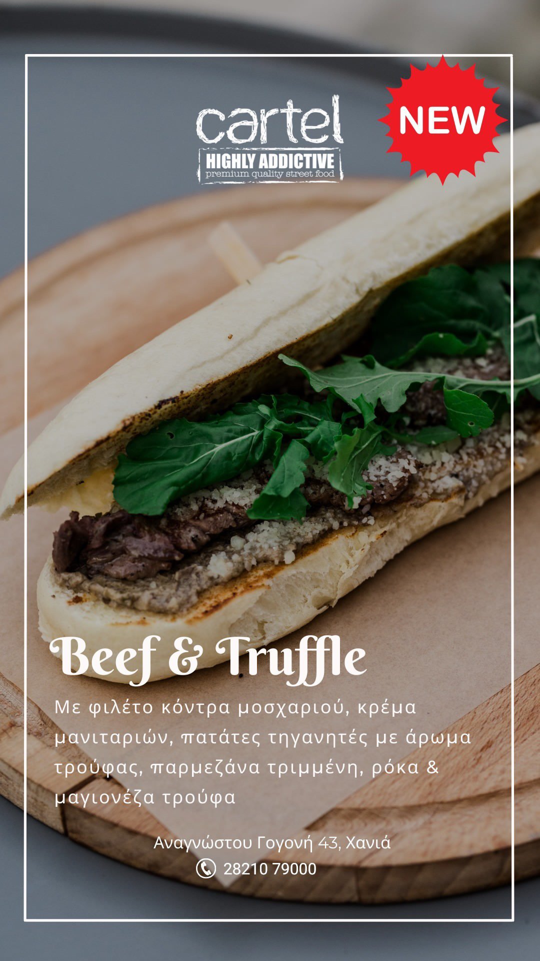 Μπιφτέκι με 100% μοσχαρίσιο κιμά, κατσικίσιο τυρί, ρόκα, σάλτσα μανιταριών, μαγιονέζα τρούφας.