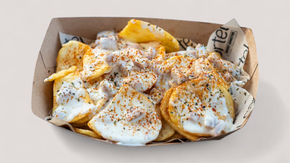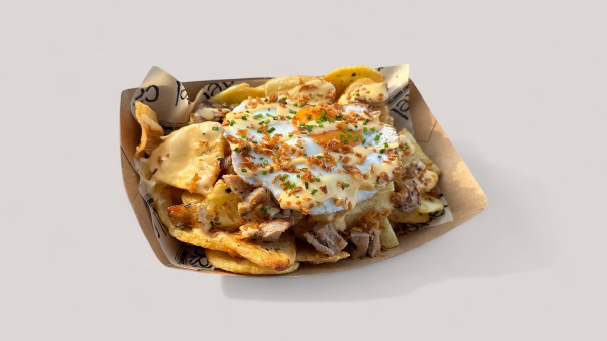Φρεσκοτηγανισμένες πατάτες με χειροποίητη κρέμα Cheddar, ψιλοκομμένη πανσέτα, αυγό τηγανητό, Κράμπλ κρεμμύδι και σχοινόπρασο!