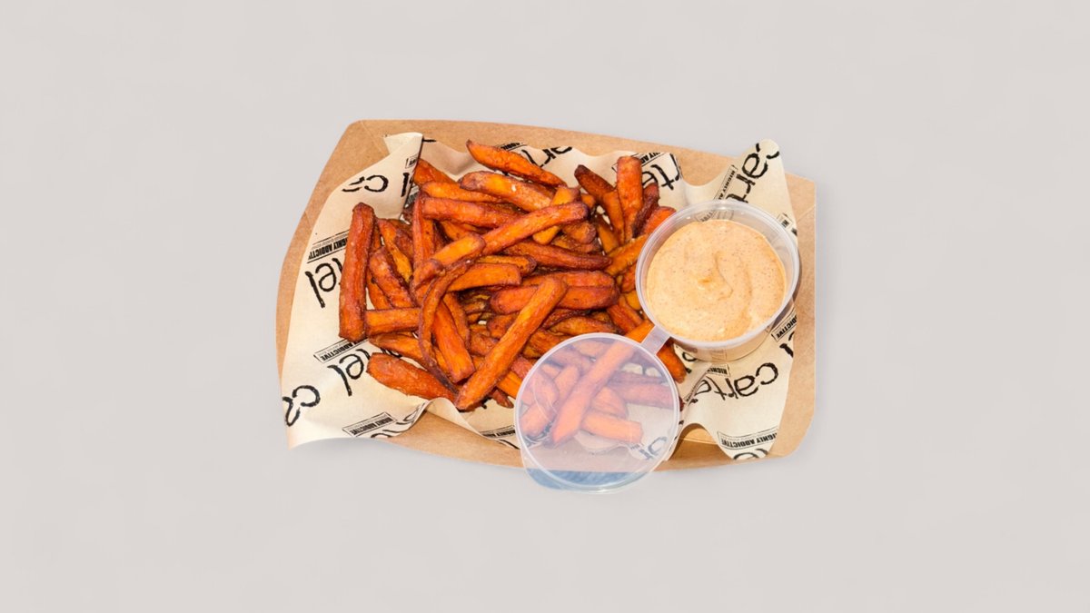 Φρεσκοτηγανισμένες τραγανές γλυκοπατάτες! Συνοδεύονται με ντιπ smoky truffle mushroom mayo !