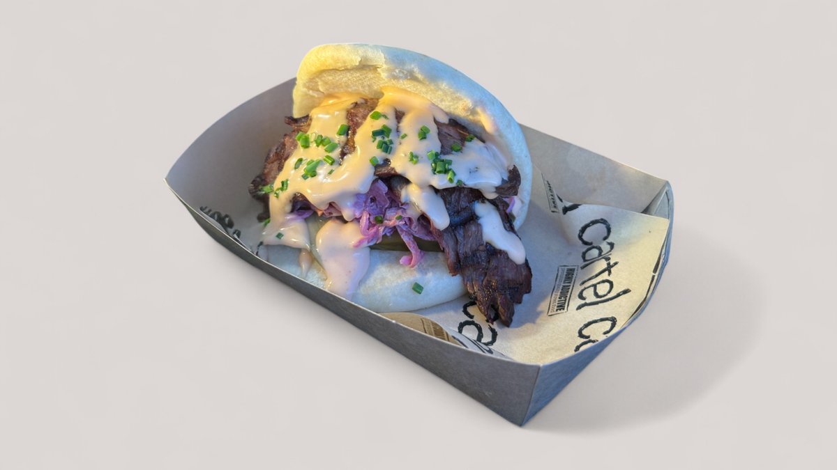 Bao bun με μοσχαρίσιο κιμά, καπνιστό provolone, crumble κρεμμύδι, καβουρδισμένο φυστίκι και ΒΒQ sauce