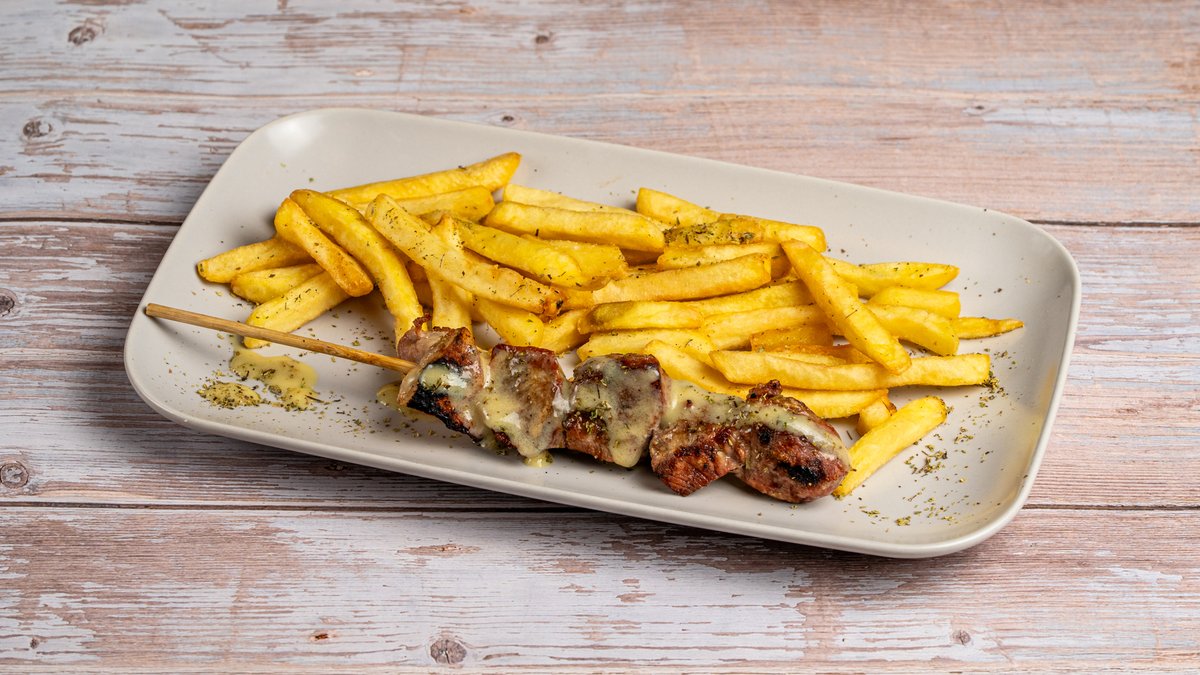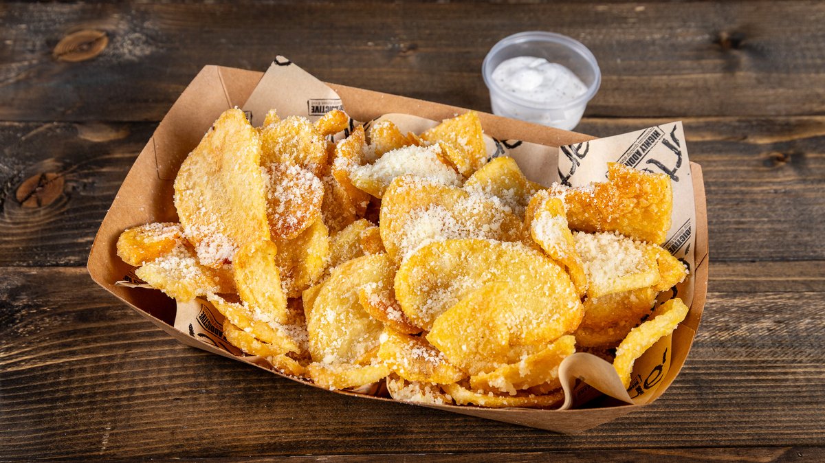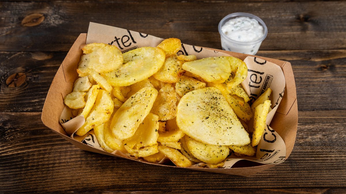 Φρεσκοτηγανισμένες πατάτες με αλάτι και ρίγανη που συνοδεύονται με dip από σπιτική μαγιονέζα, σχοινόπρασο, παρμεζάνα και σκόρδο