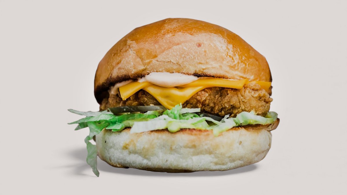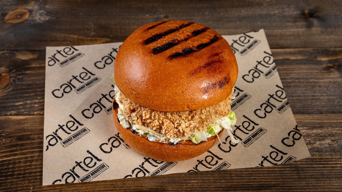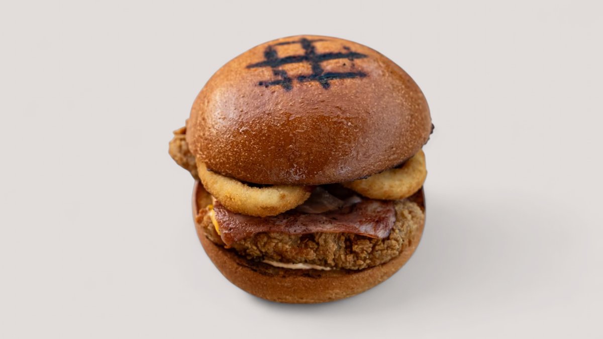 Φιλέτο κοτόπουλο πανέ, μπέικον, τσένταρ, καραμελωμένο κρεμμύδι, onion rings, καπνιστή μαγιονέζα, bbq sauce.