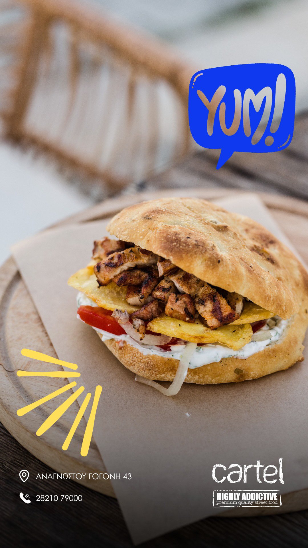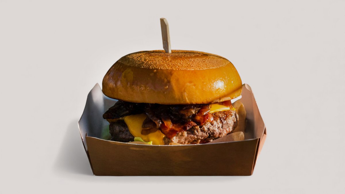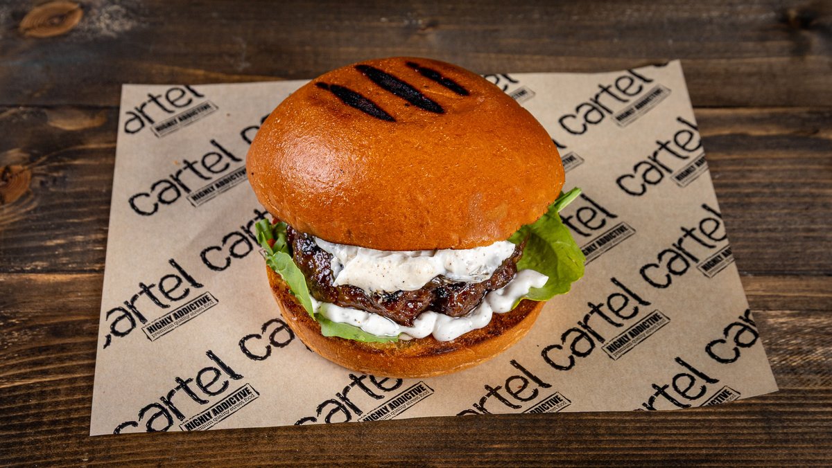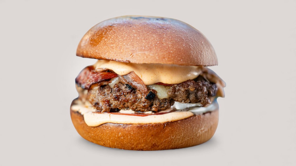 Μπιφτέκι με 100% μοσχαρίσιο κιμά, τσορίθο, καπνιστό τυρί, καραμελωμένο κρεμμύδι, ντομάτα, καπνιστή μαγιονέζα.