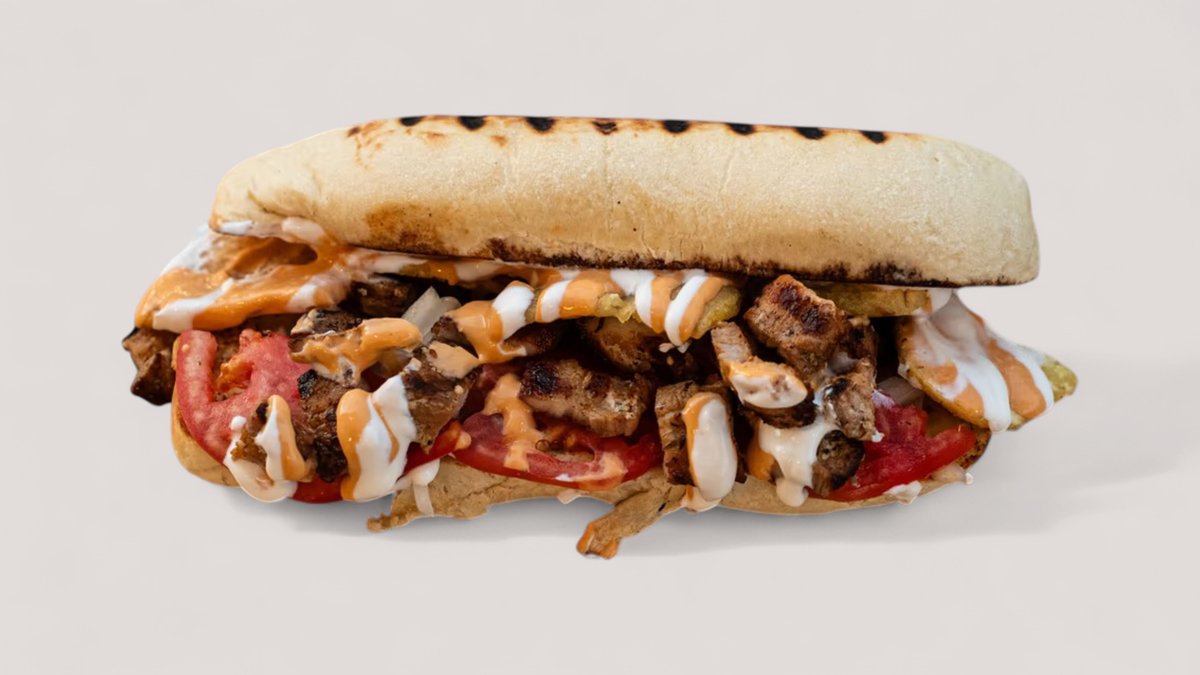 Με χοιρινή πανσέτα, gouda, πατάτες τηγανητές, ντομάτα, κρεμμύδι, γιαούρτι και secret sauce
