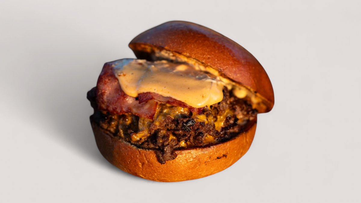 Μπιφτέκι με 100% μοσχαρίσιο κιμά, τετραπλό μπέικον, πίκλες αγγούρι, μαγιονέζα, χρυσή BBQ sauce.