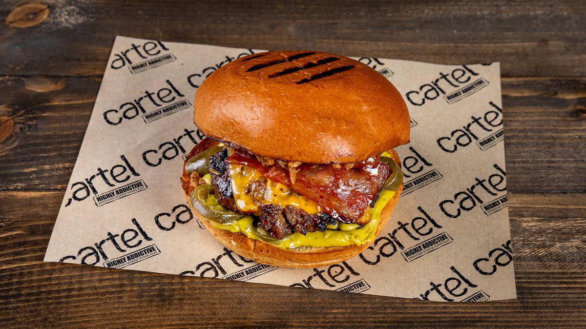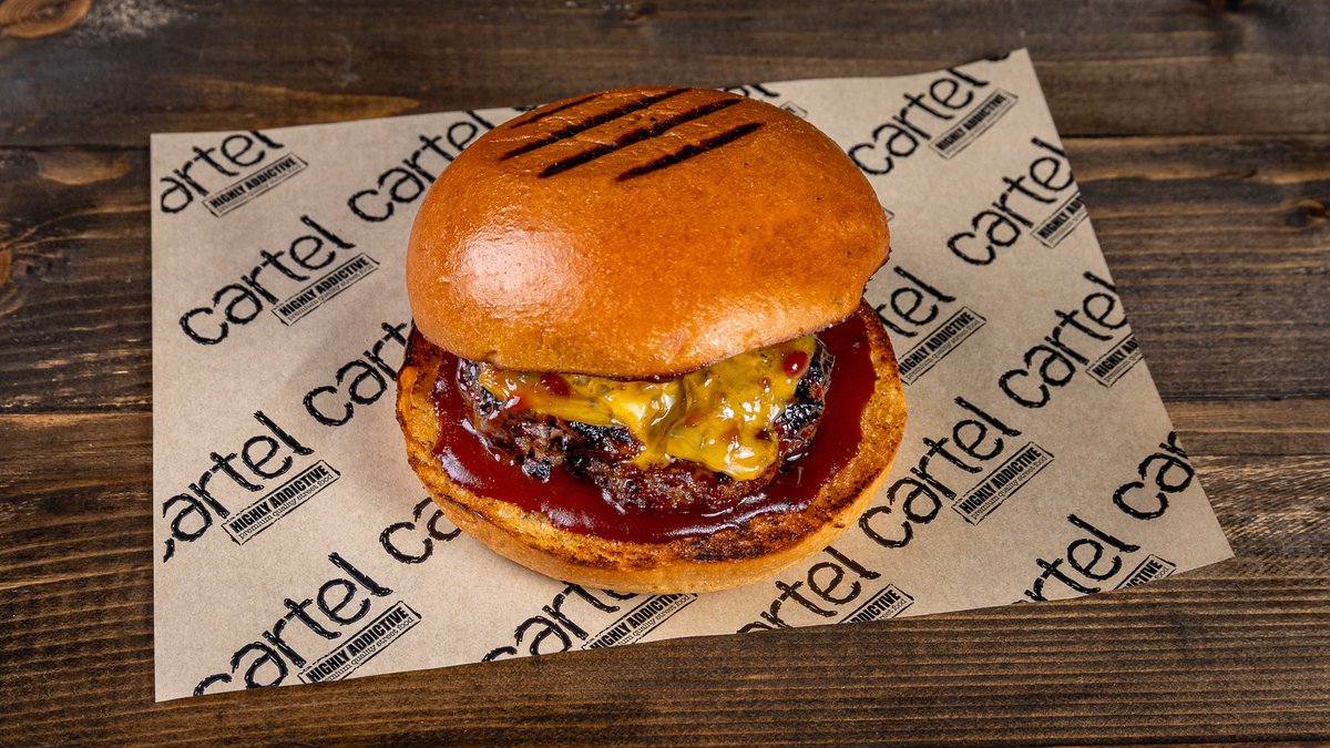 Μπιφτέκι με 100% μοσχαρίσιο κιμά, τσένταρ, μπέικον, καραμελωμένο κρεμμύδι, iceberg, ντομάτα, μαγιονέζα, bbq sauce.