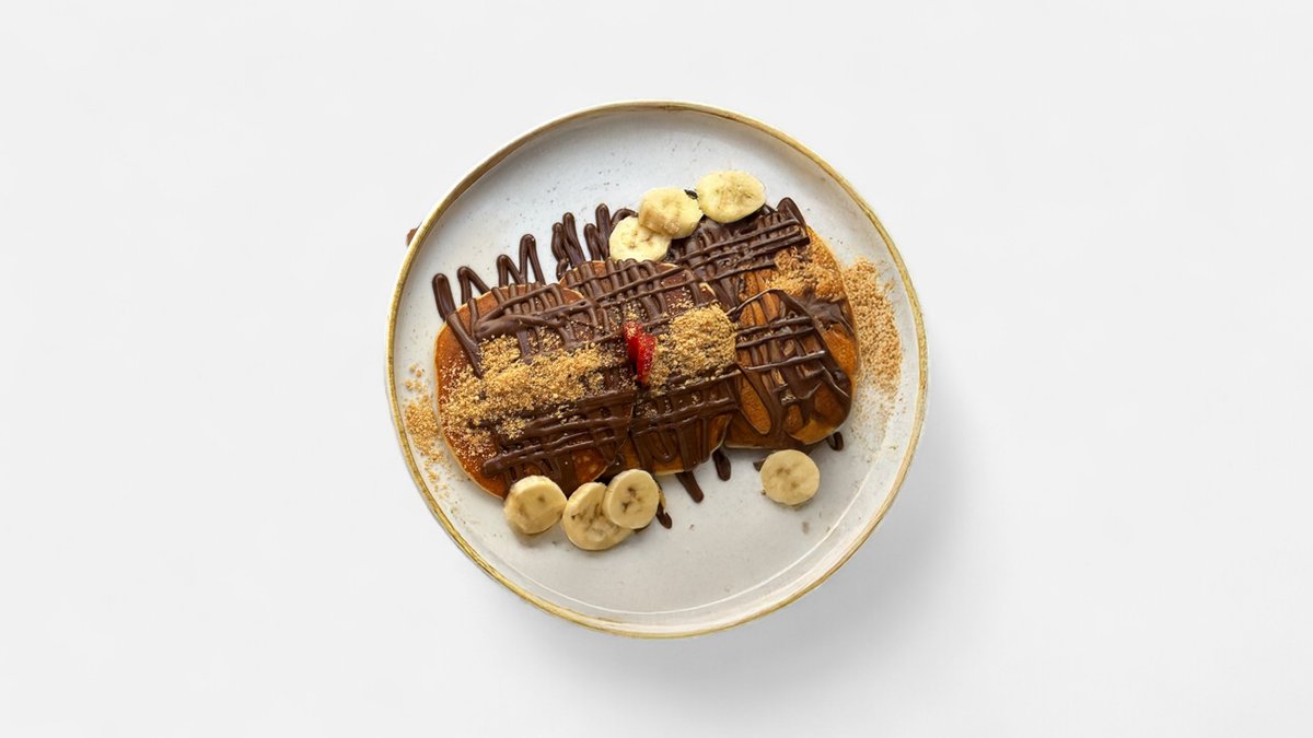 Με πραλίνα σοκολατάς, τριμμένο μπισκότο, φράουλα και μπανάνα