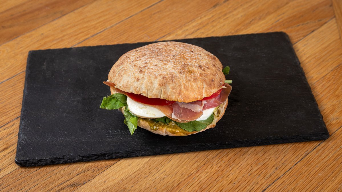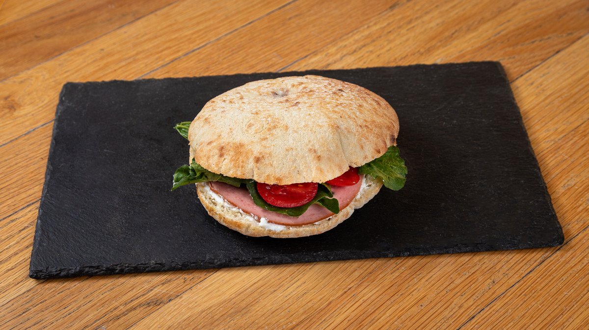 Με flatbread, μορταδέλα, κρέμα φέτας, ντοματίνια , ρόκα και πέστο βασιλικού