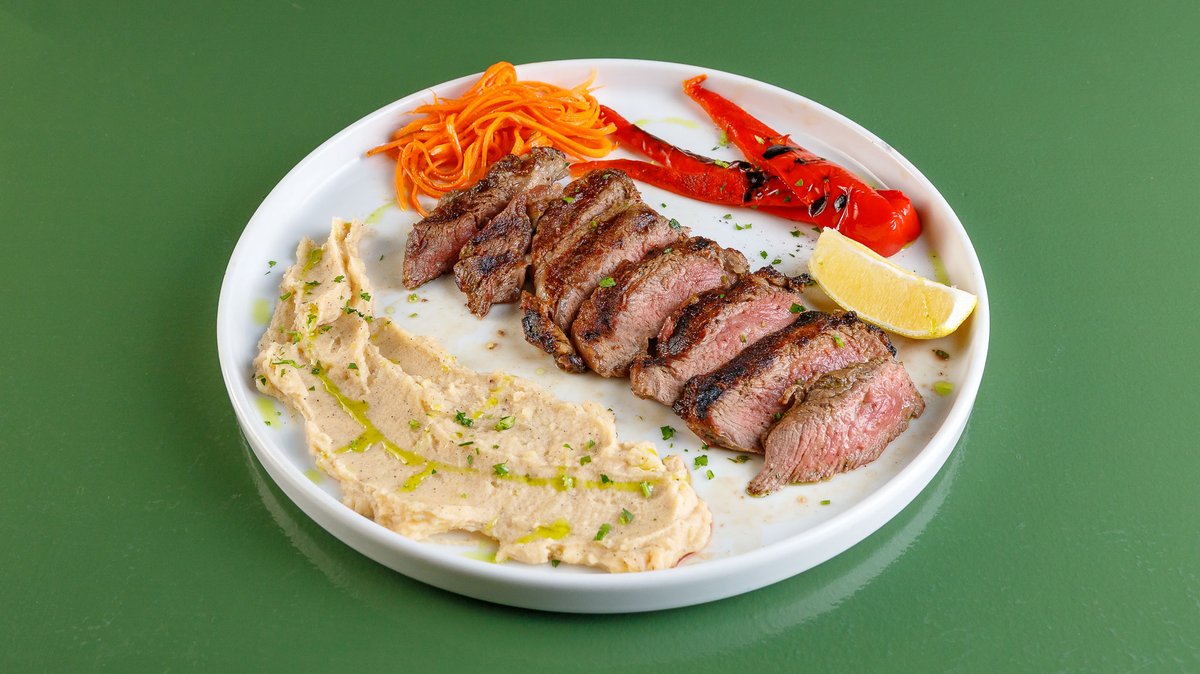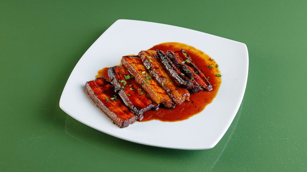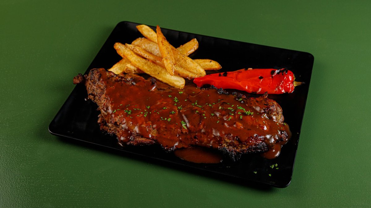 500-600g. Pork in 12-hour marinade, with French fries, roasted peppers and romeo wine sauce