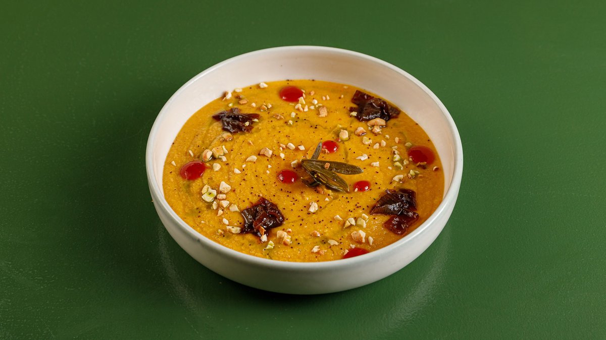 With French fries, marinated carrot, in a sauce of turmeric, curry, peppers and carrot