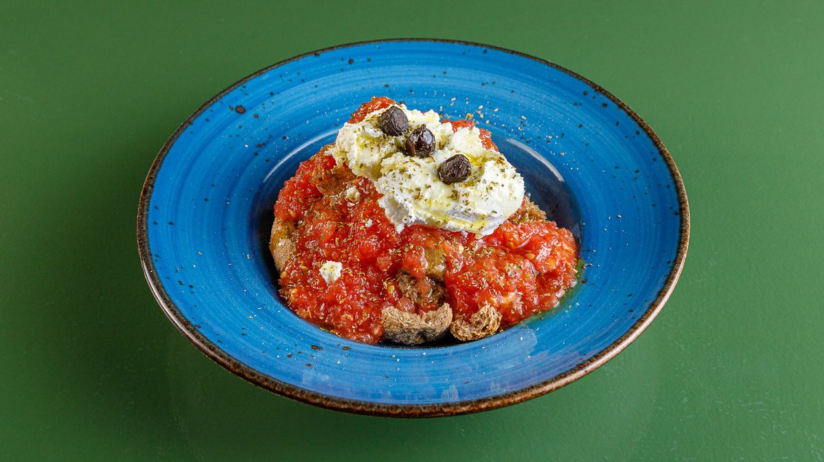 Barley rusk with freshly crushed tomato, cheese, cheese, olives, olive oil and oregano of Crete