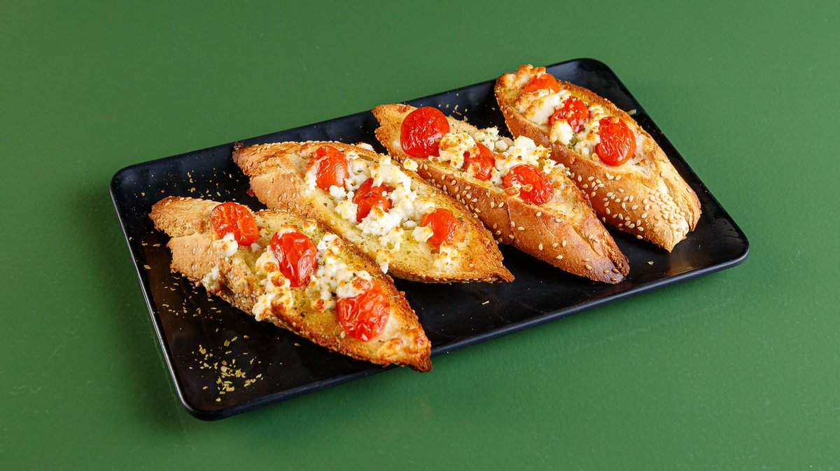 Garlic bread with tomato, feta and oregano