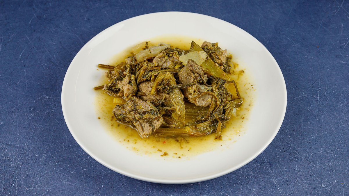 Χοιρινό, σέλινο, φρέσκο και ξερό κρεμμύδι, αυγολέμονο
