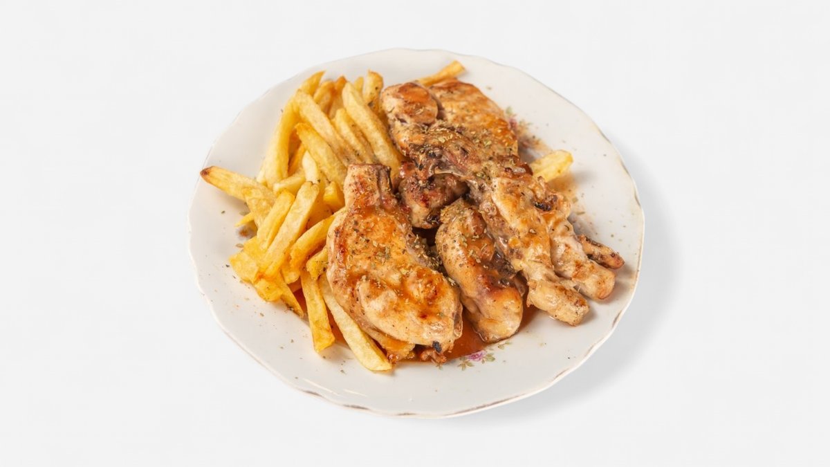 Συνοδεύεται από πατάτες τηγανητές και πίτα