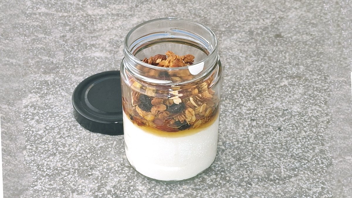 Porridge with oat flakes, chia seeds, cranberries, cinnamon, hazelnut praline, strawberry compote, sunflower seed and currant