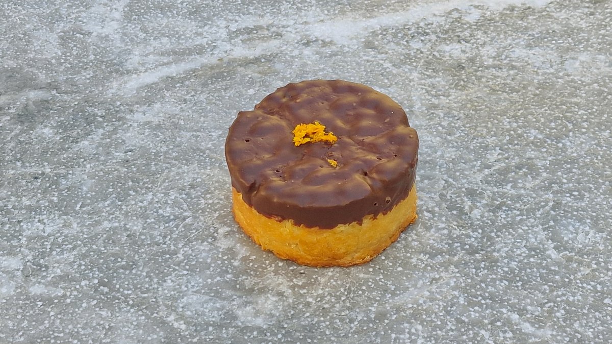 Traditional Breton dessert with caramelized croissant dough, chocolate coating and orange zest