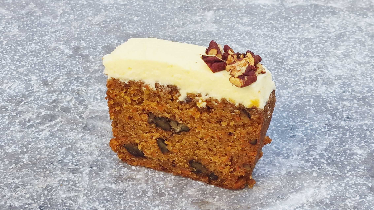 Cake with caramelized white chocolate and topped with bitter chocolate and cacao nibs