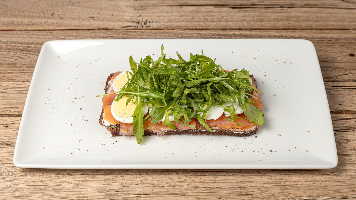 Ανοιχτό σάντουιτς σολομού, κρέμα τυριού αρωματισμένη με λεμόνι και άνηθο, αγγουράκι τουρσί, φύλλα ρόκας και αυγό σε ψωμί dinkel