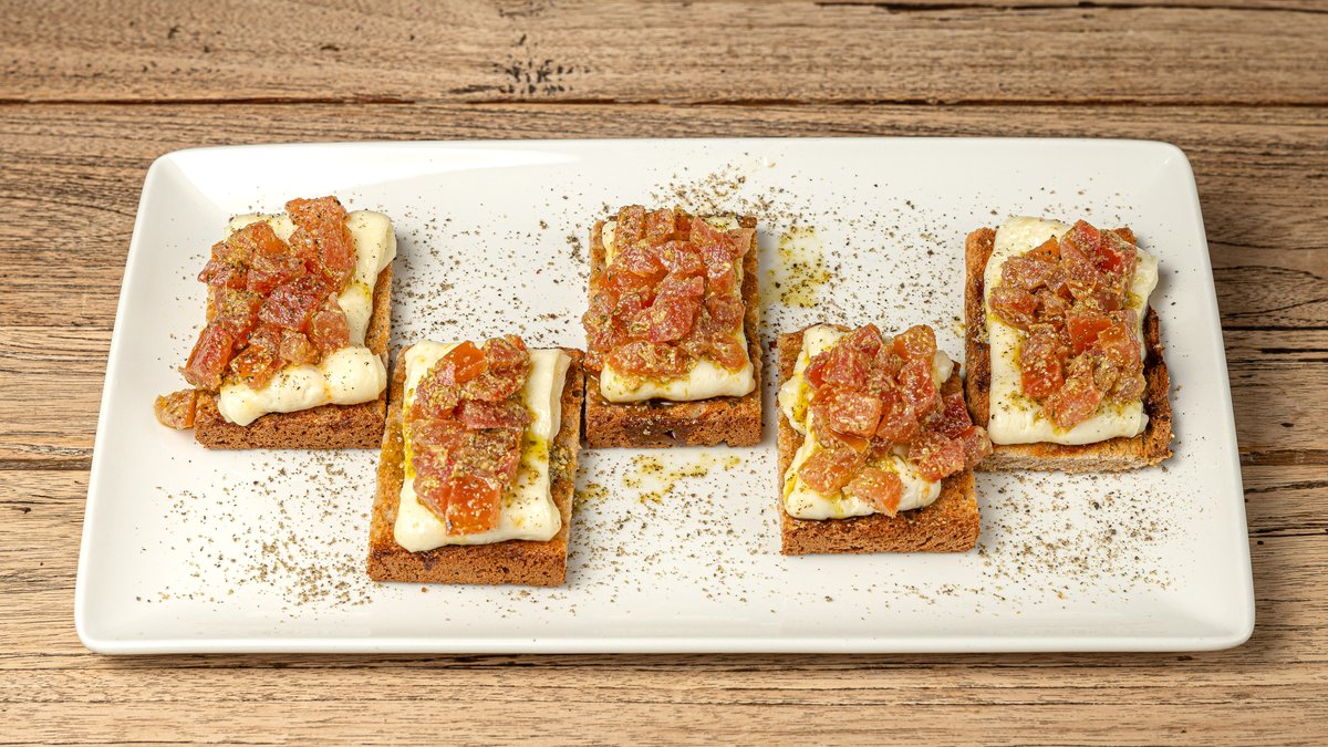 Με καπνιστό µοσχάρι, γραβιέρα Ηπείρου, ντοµάτα και κρέµα τυριού