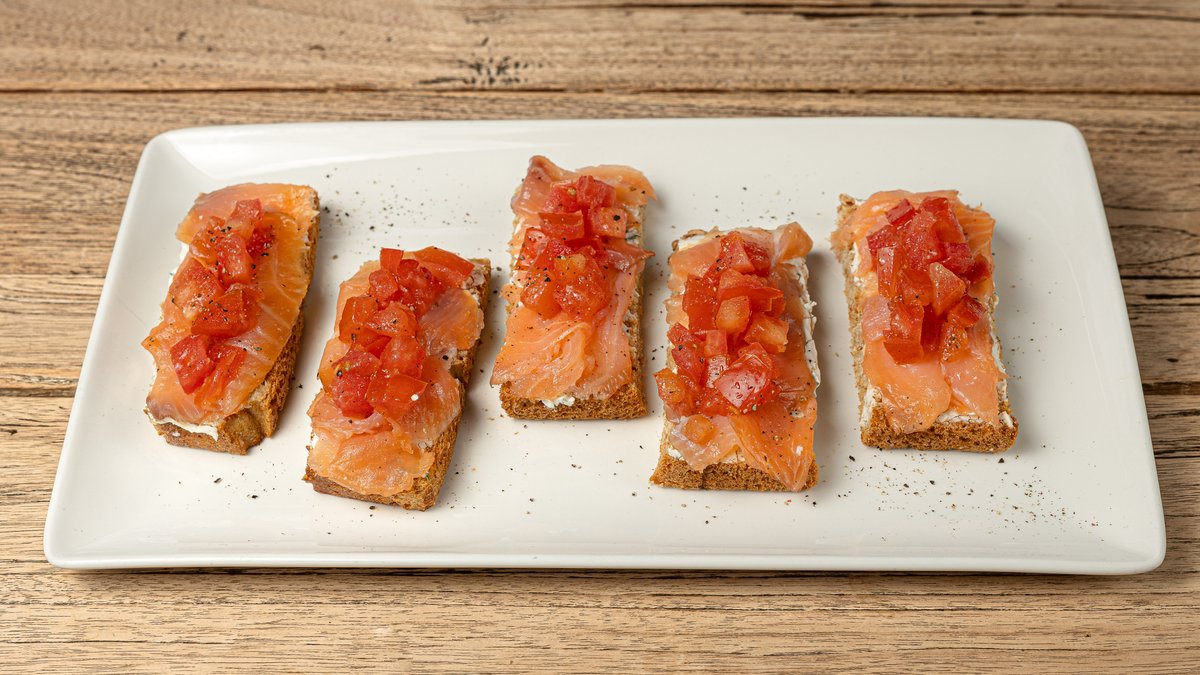 Με καπνιστό σολοµό, ντοµάτα, ρόκα, κρέµα τυριού αρωµατισµένη µε άνηθο και λαιµ