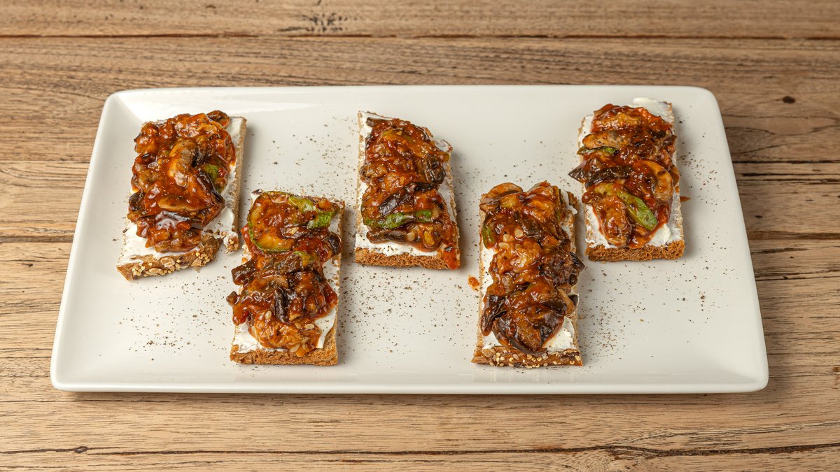 Ψητά μανιτάρια champignon, ψητή μελιτζάνα, ψητά κολοκύθια, κρέμα τυριού και σάλτσα ντομάτας