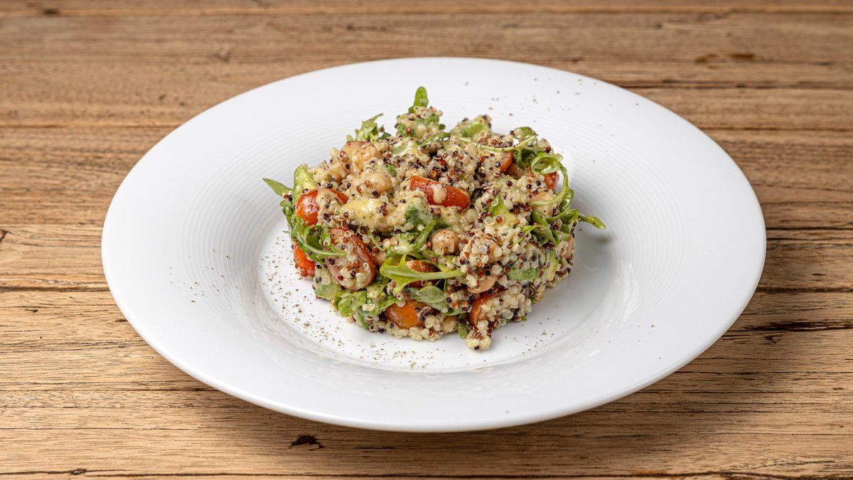 Κινόα, ρεβύθια, ντοματίνια, καρότο, αβοκάντο, ρόκα, έξτρα παρθένο ελαιόλαδο και ξύσμα λεμονιού
