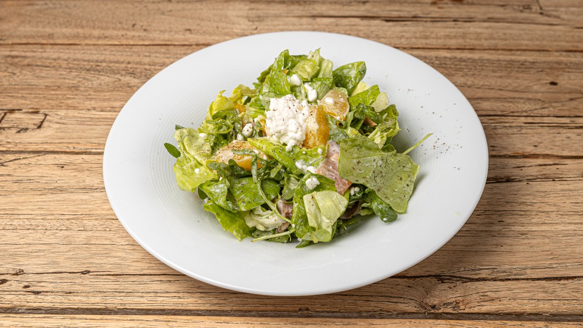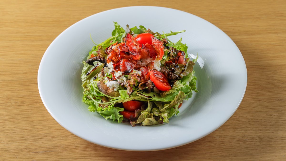Γαλλική σαλάτα, ρόκα, ντοματίνια cherry, μανιτάρια champignon, ανθότυρο, bacon, καραμελωμένο βαλσάμικο και έξτρα παρθένο ελαιόλαδο