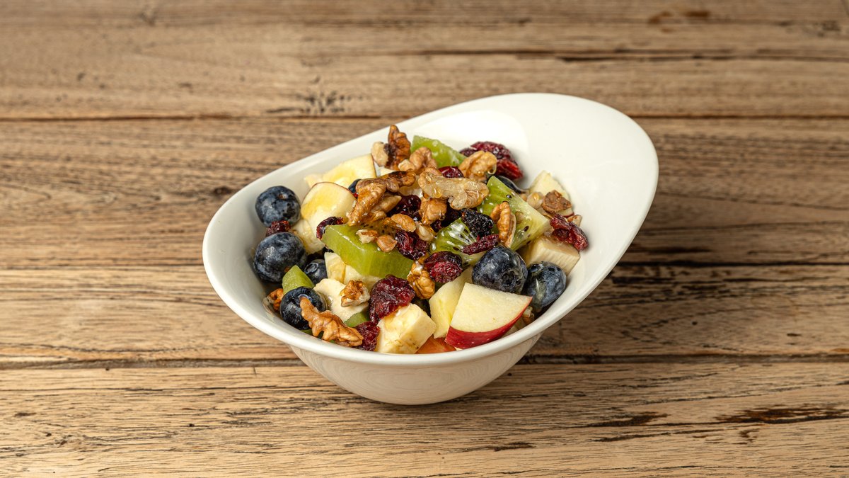 Φρουτοσαλάτα µε µέλι Χίου, καρύδια και αποξηραµένα µύρτιλα