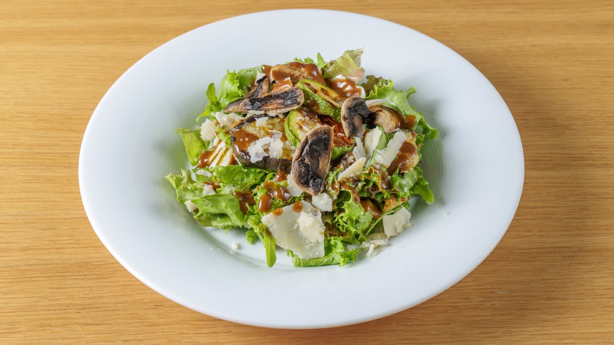 Γαλλική σαλάτα, ρόκα, ψητή μελιτζάνα, ψητά μανιτάρια champignon, ψητά κολοκύθια, παρμεζάνα Regianno και βινεγρέτ βαλσάμικου