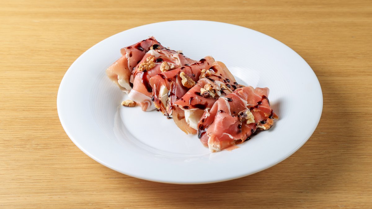 Ρολλάκια προσούτο με μοτσαρέλα buffalo, αποξηραμένα σύκα, καρύδια και γλασαρισμένο Βαλσάμικο