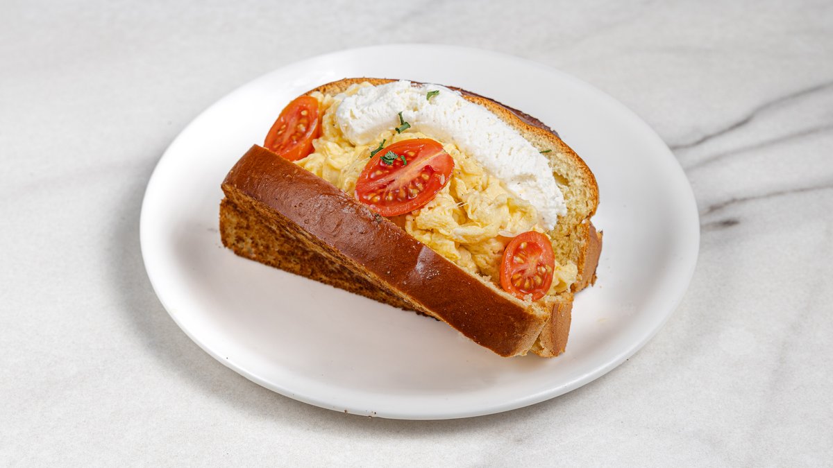 Ομελέτα αλλαντικών πάνω σε φρυγανισμένο ψωμί, κρέμα τυριού, σωτέ μανιτάρια και ντοματίνια. Συνοδεύεται από σαλάτα.