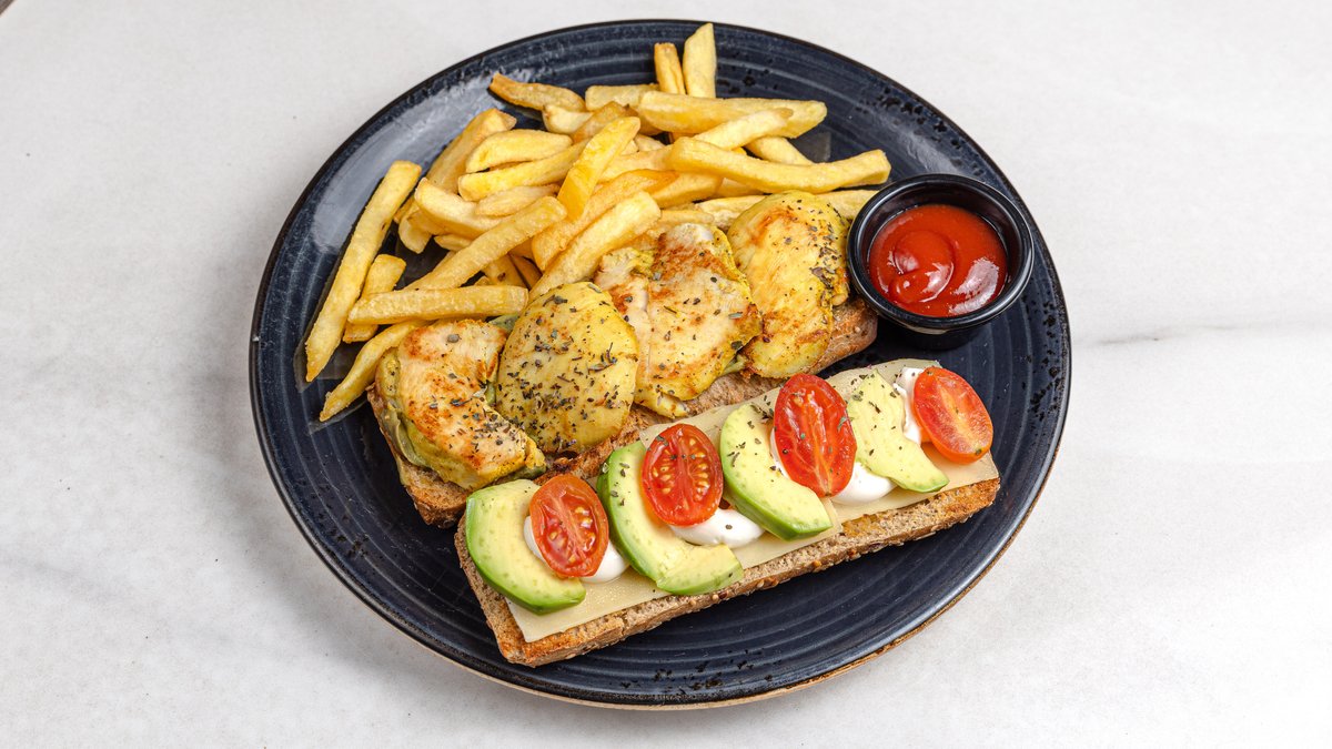 Σε πολύσπορο ψωμί, με κρέμα αβοκάντο, ντοματίνια, μαγιονέζα, μωβ λάχανο και πούδρα βασιλικού. Συνοδεύεται από πατάτες τηγανητές.