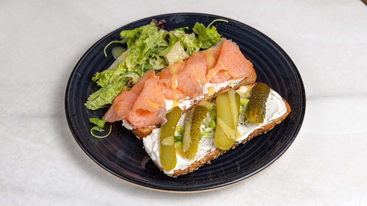 Σε πολύσπορο ψωμί, με τυρί κρέμα, κρεμμυδάκι φρέσκο, αγγουράκι τουρσί , μαϊντανό κάππαρη και dressing εσπεριδοειδών.Συνοδεύεται από σαλάτα.