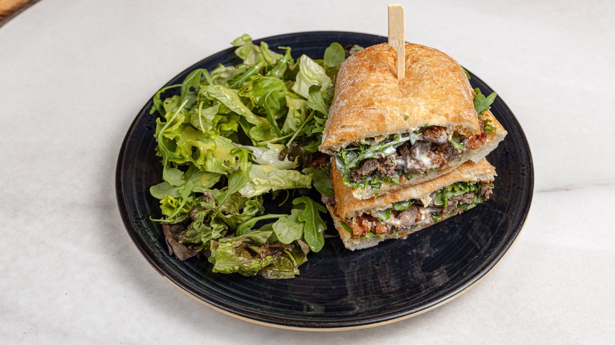 Με λεπτοκομμένο μοσχάρι, τραγανό μπέικον, ρόκα, τυρί κρέμα, φρεσκοτριμμένο πιπέρι. Συνοδεύεται από σαλάτα ή πατάτες τηγανιτές.