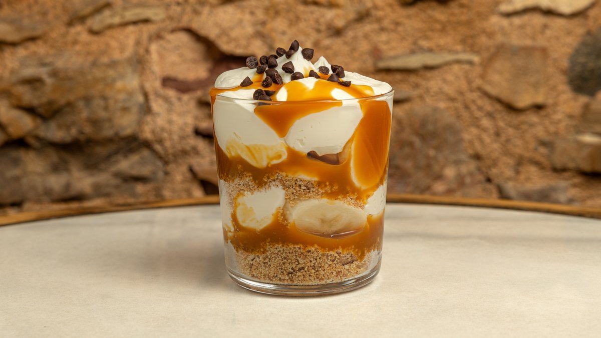 Φρέσκια μπανάνα σε κρέμα cheesecake, καραμέλα γάλακτος , σταγόνες μαύρης σοκολάτας και τριμμένο μπισκότο βουτύρου