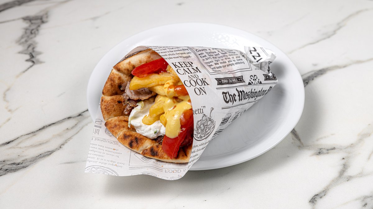Σκεπαστή με γύρο χοιρινό, τυρί και τα υλικά της επιλογής σου. Συνοδεύεται με πατάτες
