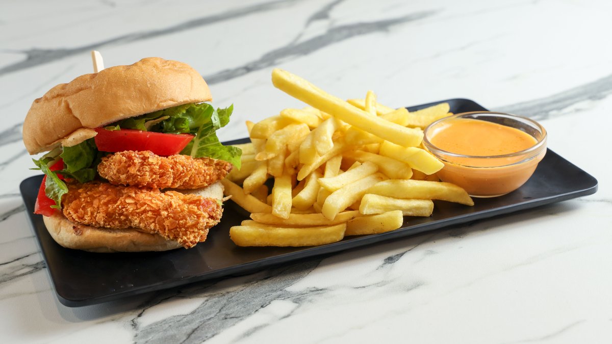 Με μπιφτέκι κοτόπουλο, τυρί γκούντα, ντομάτα, μαρούλι, σως. Συνοδεύεται με πατάτες τηγανιτές.
