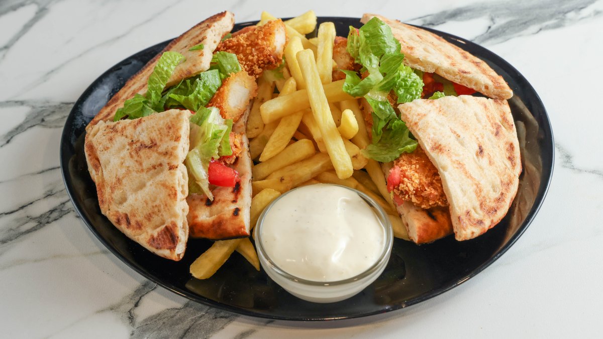 Με φιλετίνι κοτόπουλο παναρισμένο με δημητριακά, τυρί γκούντα, ντομάτα, μαρούλι, σως mac. Συνοδεύεται με πατάτες τηγανιτές