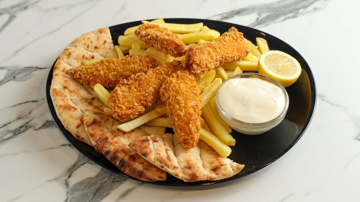 Φιλετίνια κοτόπουλου παναρισμένα με δημητριακά. Συνοδεύεται με πατάτες τηγανητές και σως της επιλογής σας
