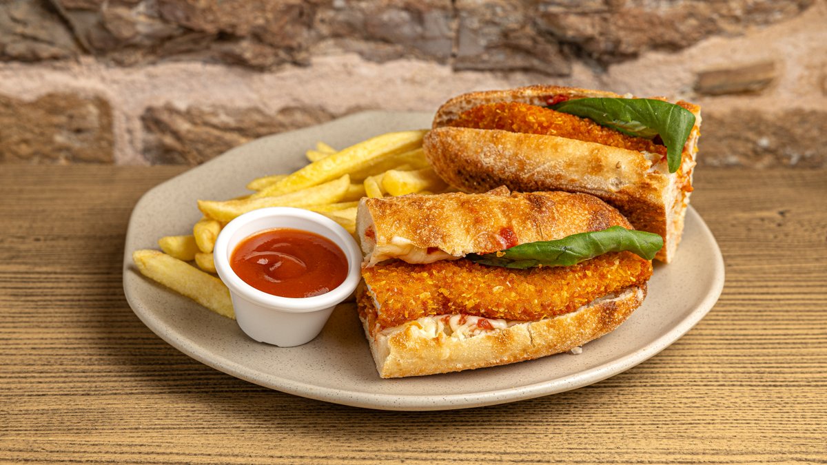 Με κοτόπουλο πανέ, τυρί, ντομάτα, μαρούλι και σως. Συνοδεύεται από πατάτες τηγανητές ή σαλάτα