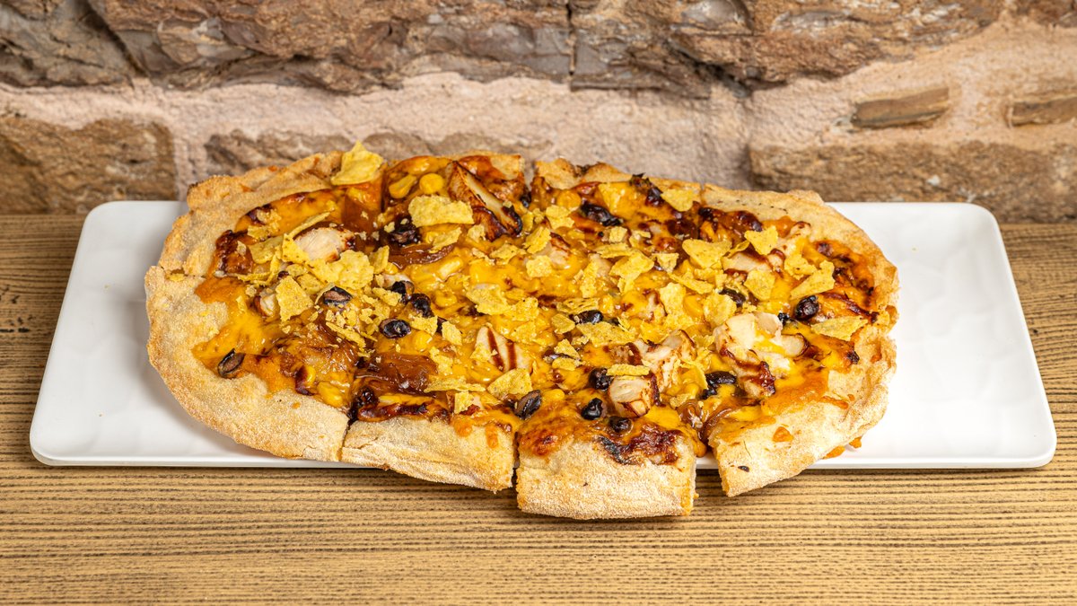 Καλαμπόκι, μαύρα φασόλια, τσένταρ τυρί καραμελωμένο κρεμμύδι και κομμάτια τραγανής τορτίγιας