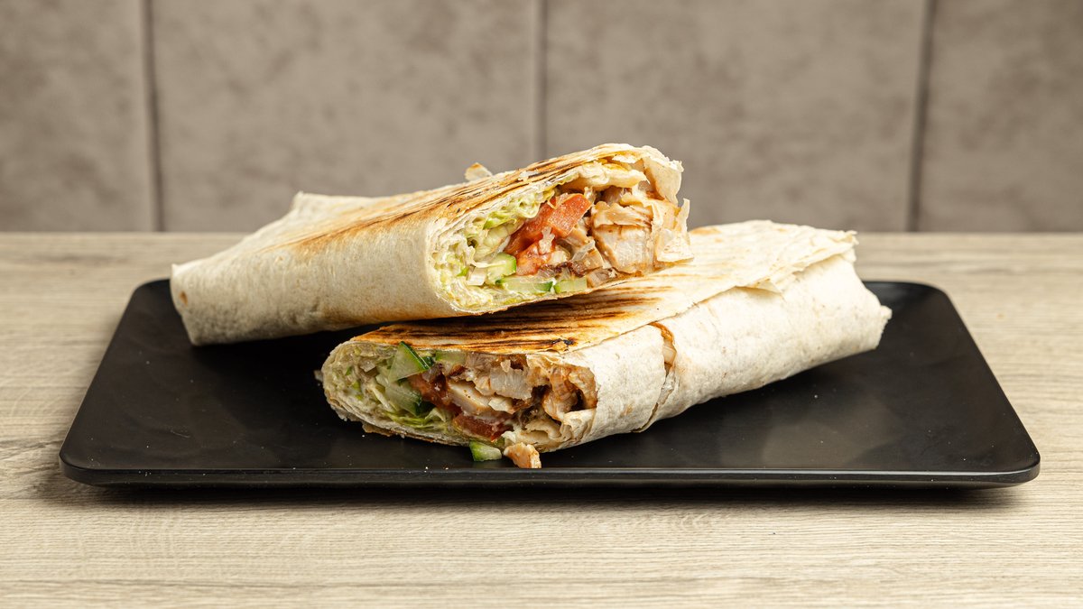 Με μαριναρισμένο μπούτι κοτόπουλο, μαρούλι, ντομάτα, κρεμμύδι, πιπεριά καυτερή, κέτσαπ και sauce shaurma