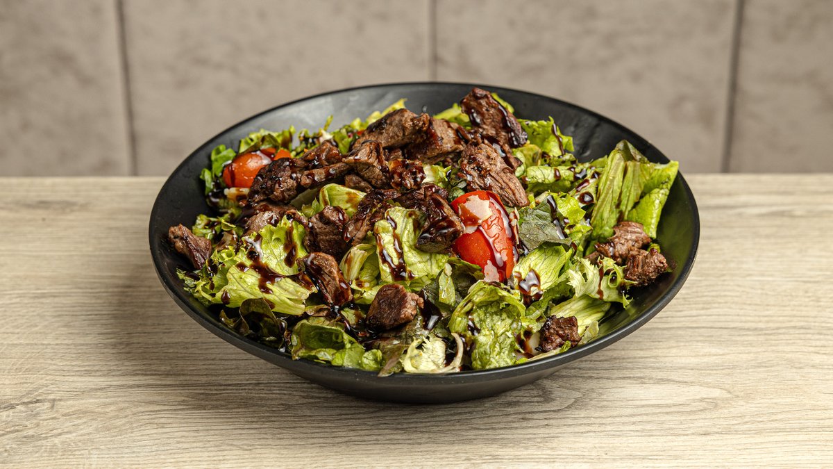 With salad leaves, cherry tomatoes, parmesan, avocado, suckling veal and balsamic sauce