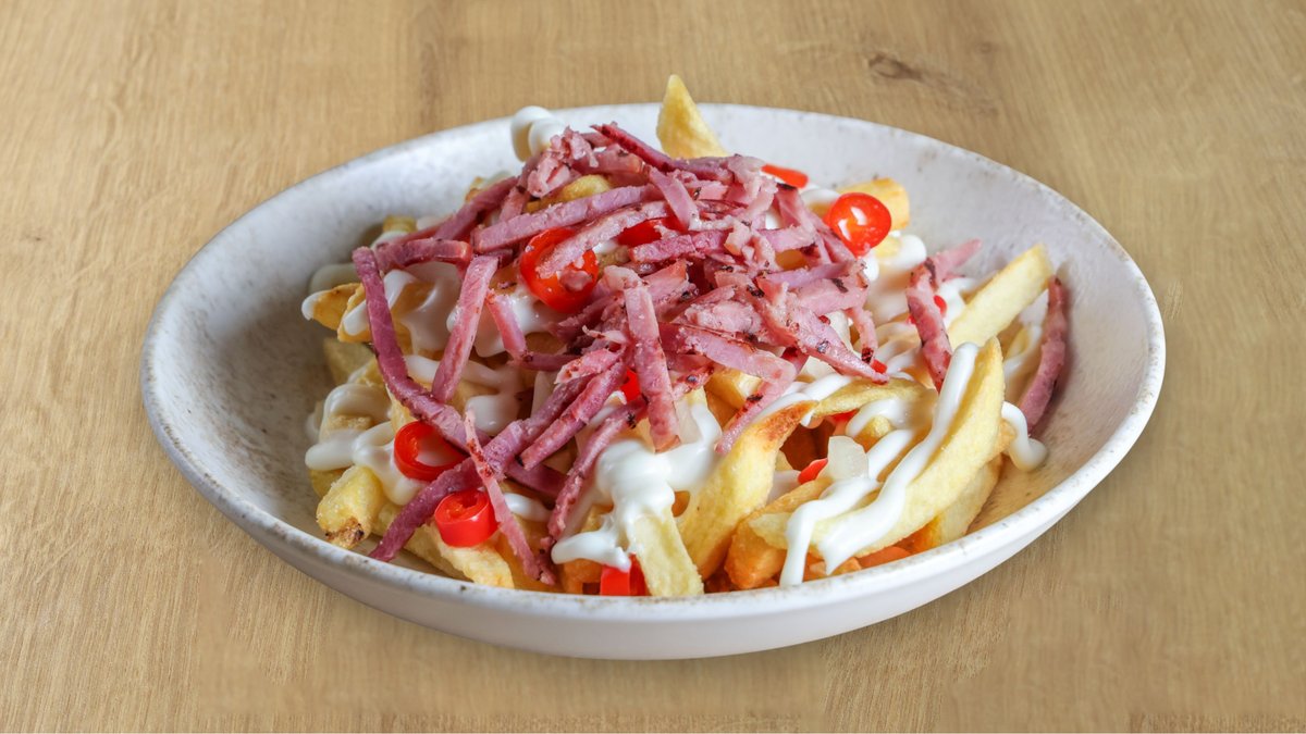 Πατάτες Τηγανητές με Kρέμα από Γραβιέρα Κρήτης, Μπέικον και Καυτερές Πίκλες