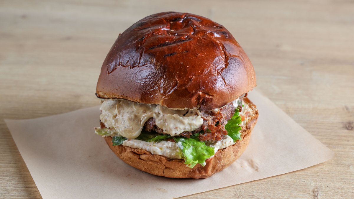 Με μπιφτέκι προβατίνας, κατσικίσιο τυρί, μαγιονέζα πράσο, pico de gallo, πίκλα αγγούρι