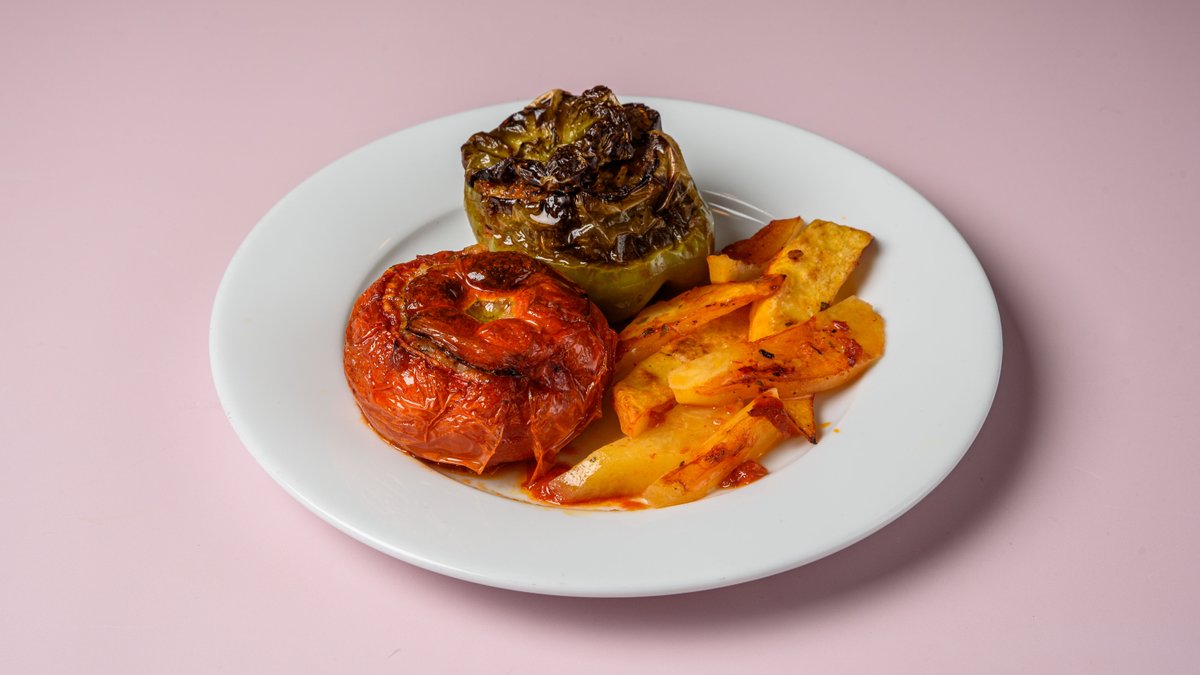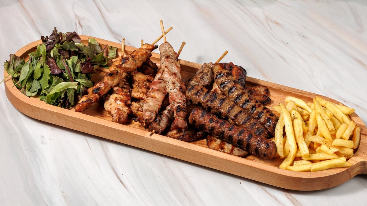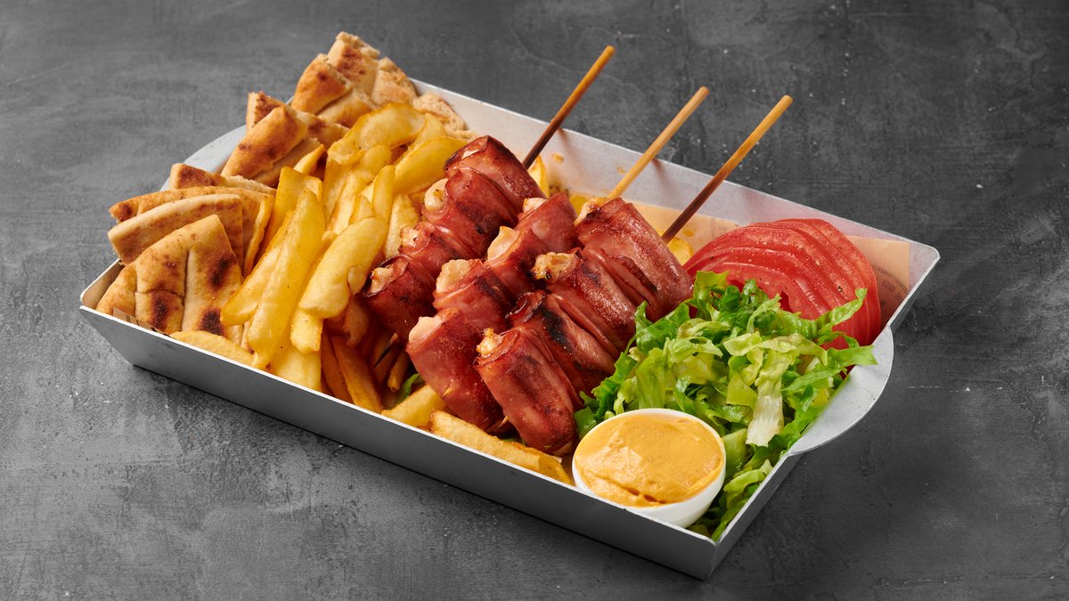 Συνοδεύεται από πατάτες, ντομάτα, κρεμμύδι και τζατζίκι