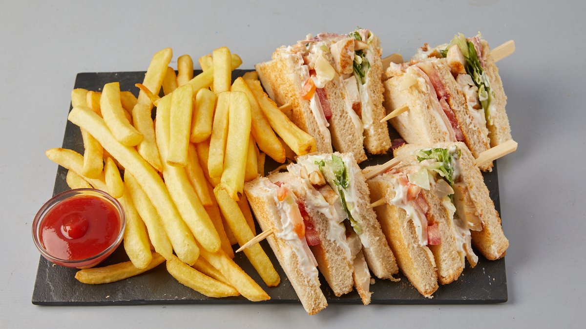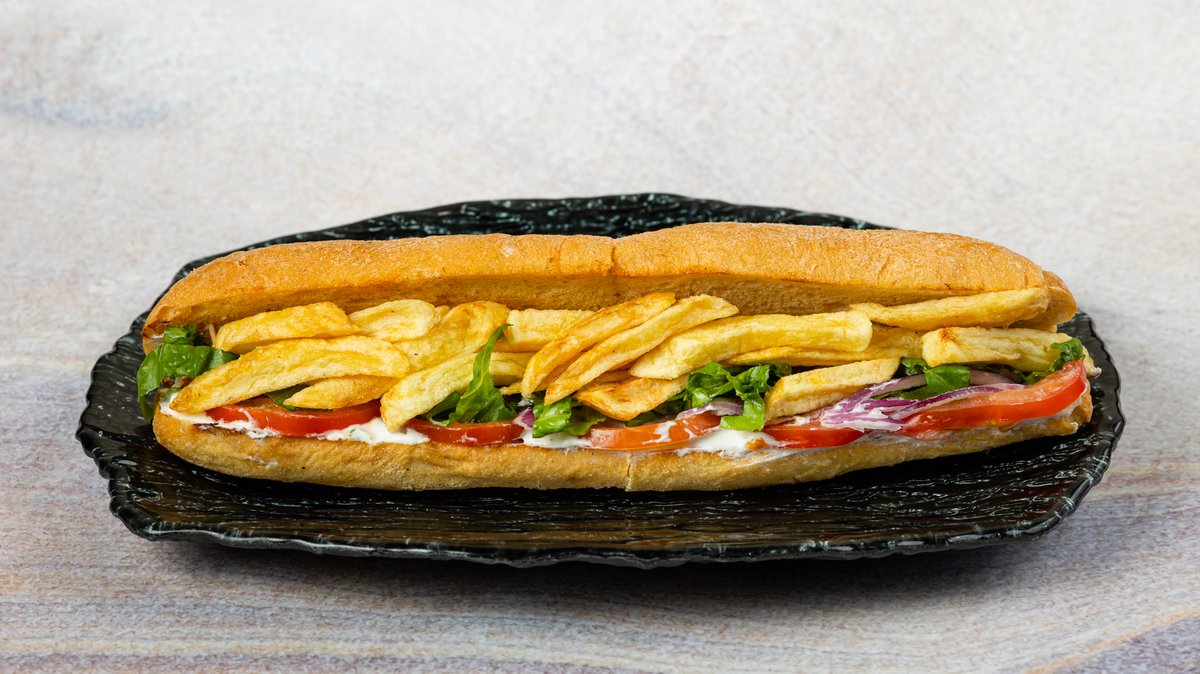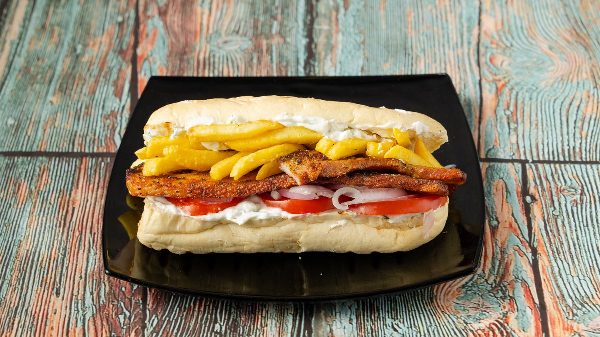 Με gouda, ζαμπόν, μπέικον, ντομάτα, μαρούλι και μαγιονέζα. Συνοδεύεται από πατάτες τηγανητές
